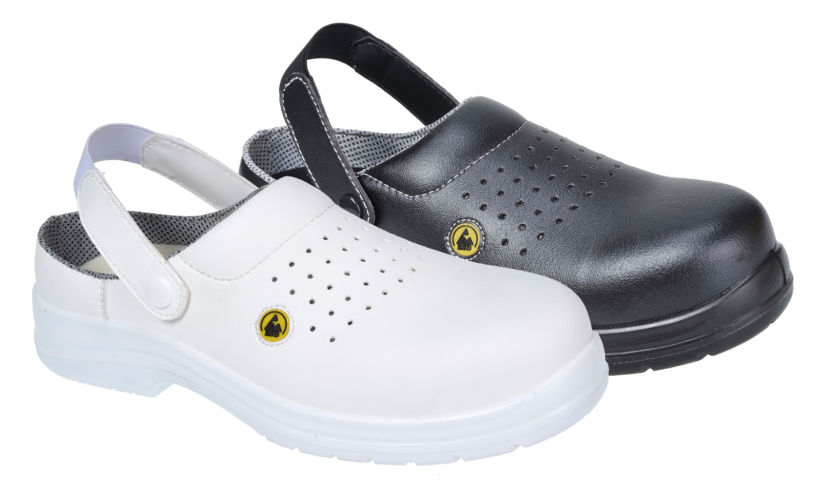 Lightweight safety clog with a perforated upper for added breathability. 100% non metallic with plastic stud fastener. Suitable for use in ESD environments. Complies with EN 61340-5-1.